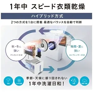 パナソニックの独自開発したハイブリット方式は、デシカント方式とコンプレッサー方式を切り替えながら運転し、ムダな電気代を抑えつつ1年中パワフルに除湿・衣類乾燥ができます