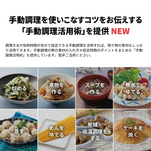 「手動調理活用術」はCOCORO HOMEアプリ、COCORO KITCHENレシピサービス、および本体に付属するメニュー集からも参照できます。