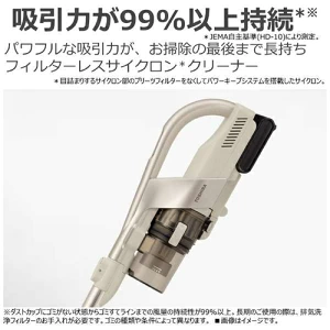 | タイプ | コードレスクリーナー フィルターレスサイクロン式*目詰まりするサイクロン部のプリーツフィルターをなくしたサイクロン |