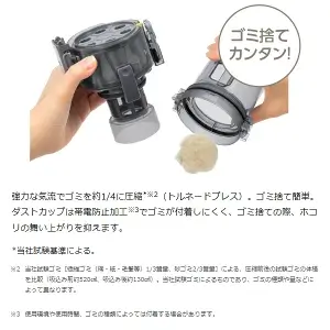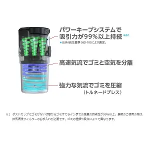 2段階の遠心分離で微細なチリまで分離 水洗い可(サイクロン部、ダストカップ) | |