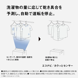 カラッとセンサー(湿度センサー)とエコナビ(AI)で、放っておいても洗濯物が乾いた後もつけっぱなしになることなく、無駄な電力消費を防ぐことができます。